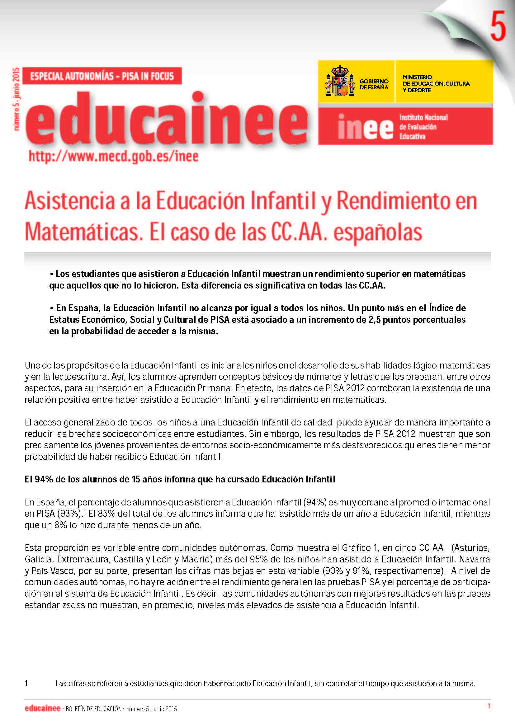 Boletín de educación educainee. Especial autonomías nº 5. Asistencia a la Educación Infantil y rendimiento en Matemáticas. El caso de las Comunidades Autónomas españolas