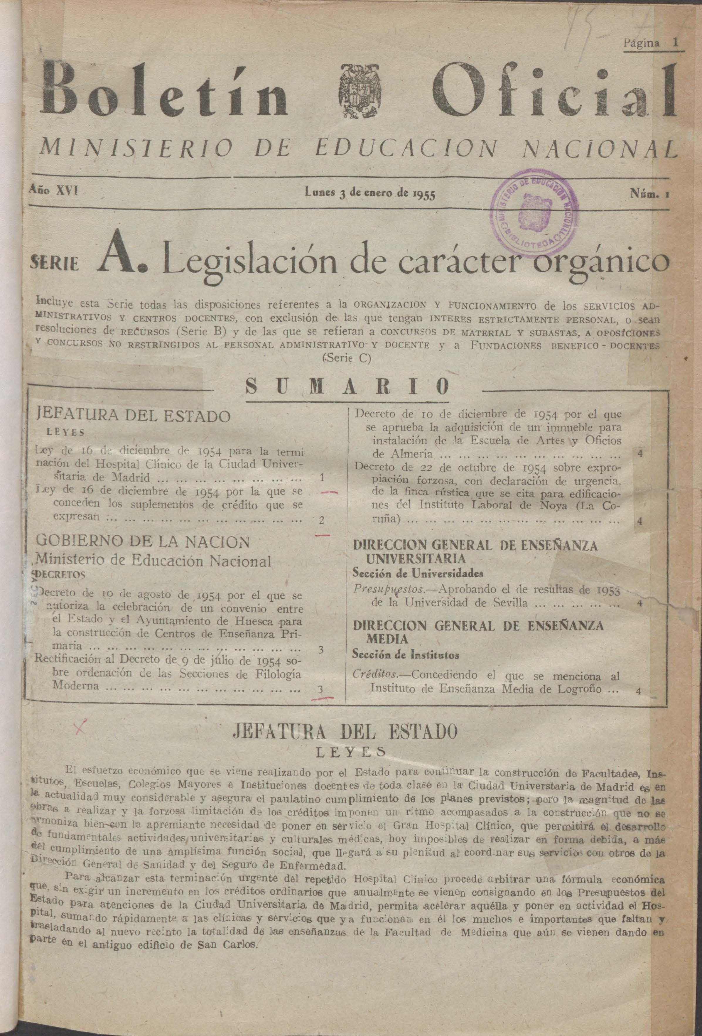 Boletín Oficial del Ministerio de Educación Nacional año 1955-1. Resoluciones Administrativas. Serie A: números del 1 al 28 más 1 número especial, 1 número extraordianio e índice 1954 de la serie A ; Serie B: números del 1 al 30 más 2 números extraordinar