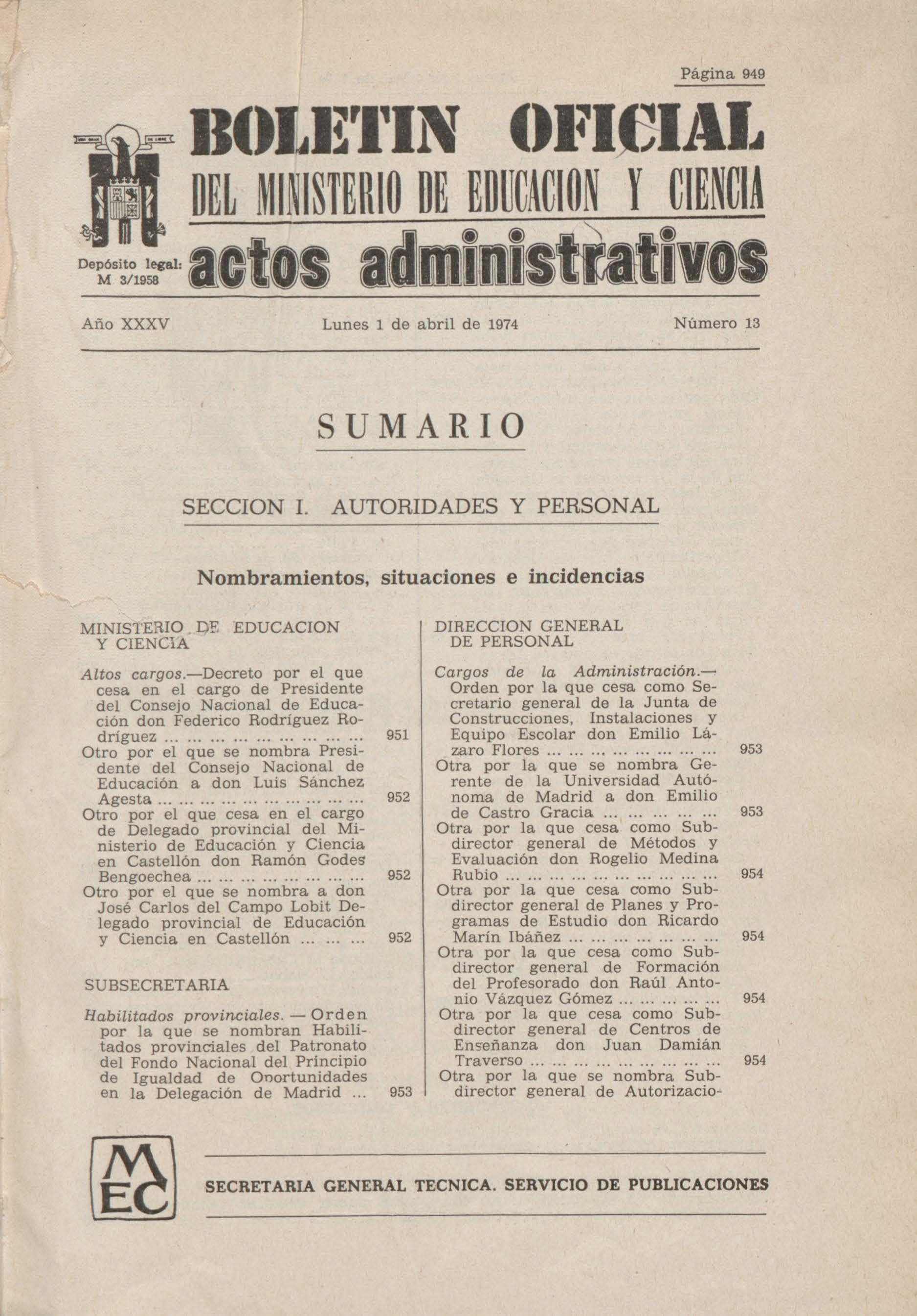 Boletín Oficial del Ministerio de Educación y Ciencia año 1974-2. Actos Administrativos. Números del 13 al 25 e índice 2º trimestre