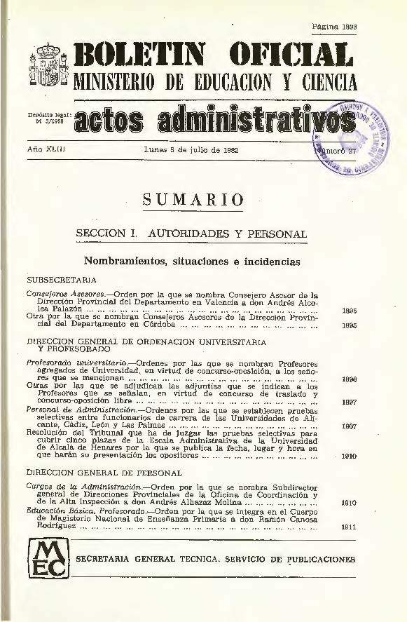 Boletín Oficial del Ministerio de Educación y Ciencia año 1982-3. Actos Administrativos. Números del 27 al 39 e índices 2º y 3º trimestres