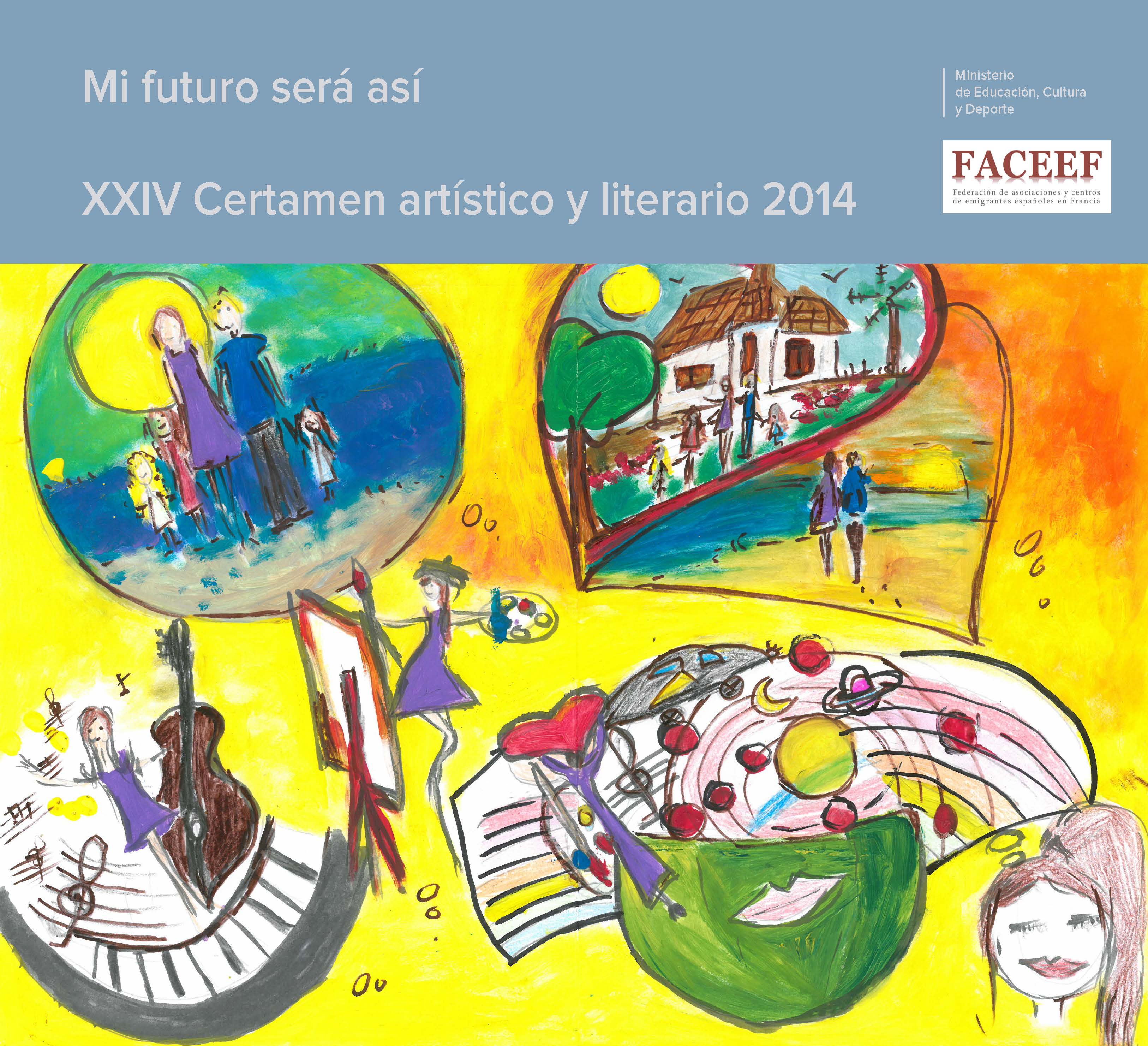 Desde hace veintidós años, la Federación de Asociaciones y centros de emigrantes españoles en Francia (FACEEF) viene organizando un certamen artístico y literario en el que participan casi un millar de alumnos que cursan estudios en todos los programas de la acción educativa española en Francia, es decir, centros de titularidad del Estado español, aulas de lengua y cultura españolas y secciones internacionales españolas en el marco del sistema educativo francés. De entre todos estos trabajos, un jurado compuesto de un asesor técnico, varios profesores dependientes de la Consejería de educación en Francia y representantes de la FACEEF, selecciona los mejores de cada categoría: por edad en la modalidad artística; por edad y tipo de programa en la modalidad literaria (puede ser prosa o verso). Este catálogo recoge todas las obras premiadas. El tema del certamen de 2014 fue: Mi futuro será así. Nuestra sociedad y nuestro mundo vienen sufriendo profundos cambios desde principios de siglo. Pero ¿cómo se imaginan el mundo del futuro nuestros niños y adolescentes? Se ha dedicado la convocatoria del certamen de 2014 al futuro, para que los alumnos de español de los programas de la Consejería de Educación en Francia den rienda suelta a su imaginación y reflexionen sobre el mundo que ellos van a contribuir a crear y en el que deberán vivir. Como sucede cuando leemos un antiguo libro de ciencia ficción o vemos una película futurista realizada hace décadas, en el ambiente se refleja la sociedad del tiempo en el que fueron creados y, a la vez, se introducen elementos fantásticos que nunca tuvieron lugar. Sin embargo, una parte de lo imaginado se ha ido cumpliendo. Nuestros alumnos han hecho sus apuestas y dentro de unas décadas comprobaremos en qué acertaron.