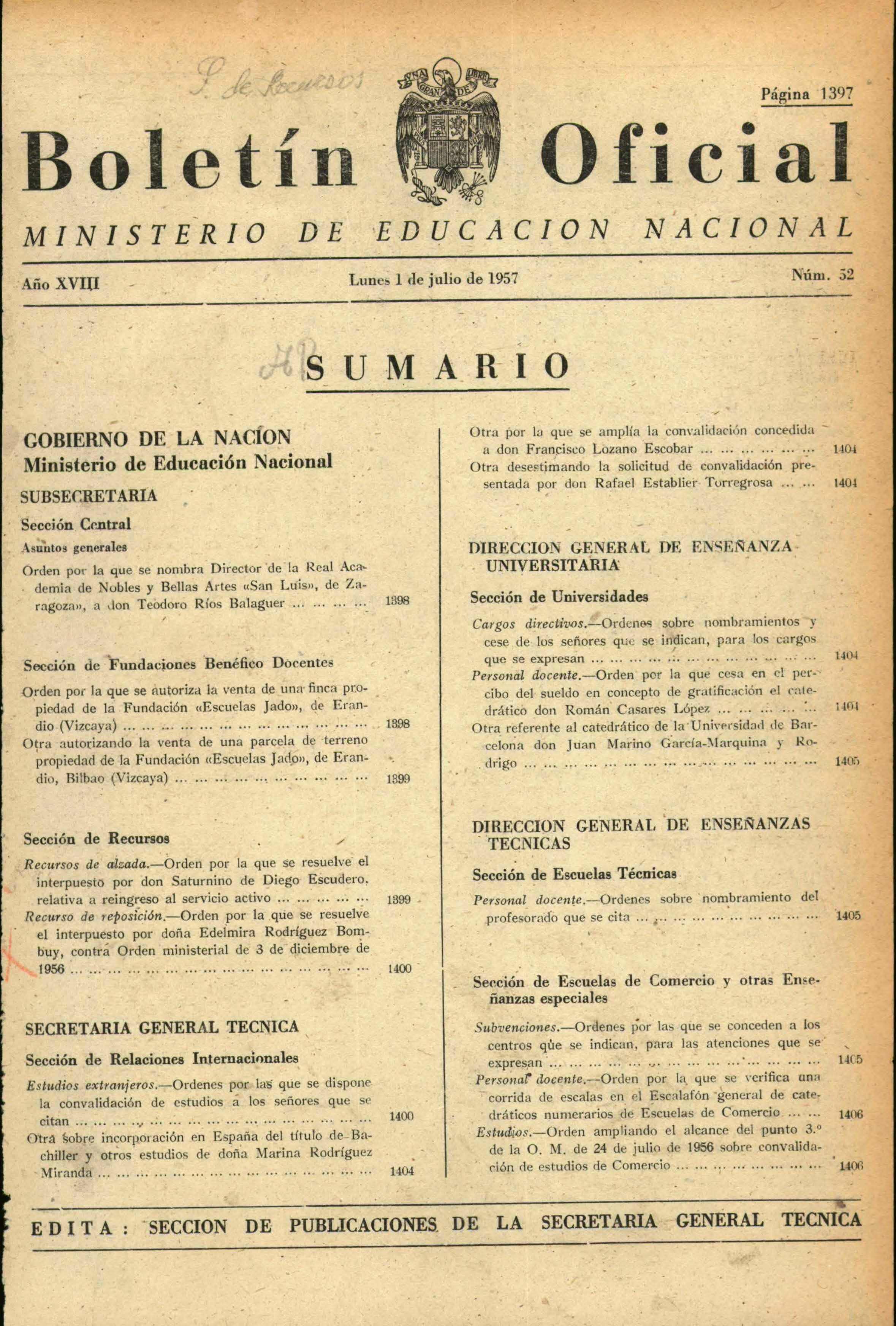 Boletín Oficial del Ministerio de Educación Nacional año 1957-1. Resoluciones Administrativas. Números del 1 al 51 más 1 número extraordinario e índice 2º semestre 1956