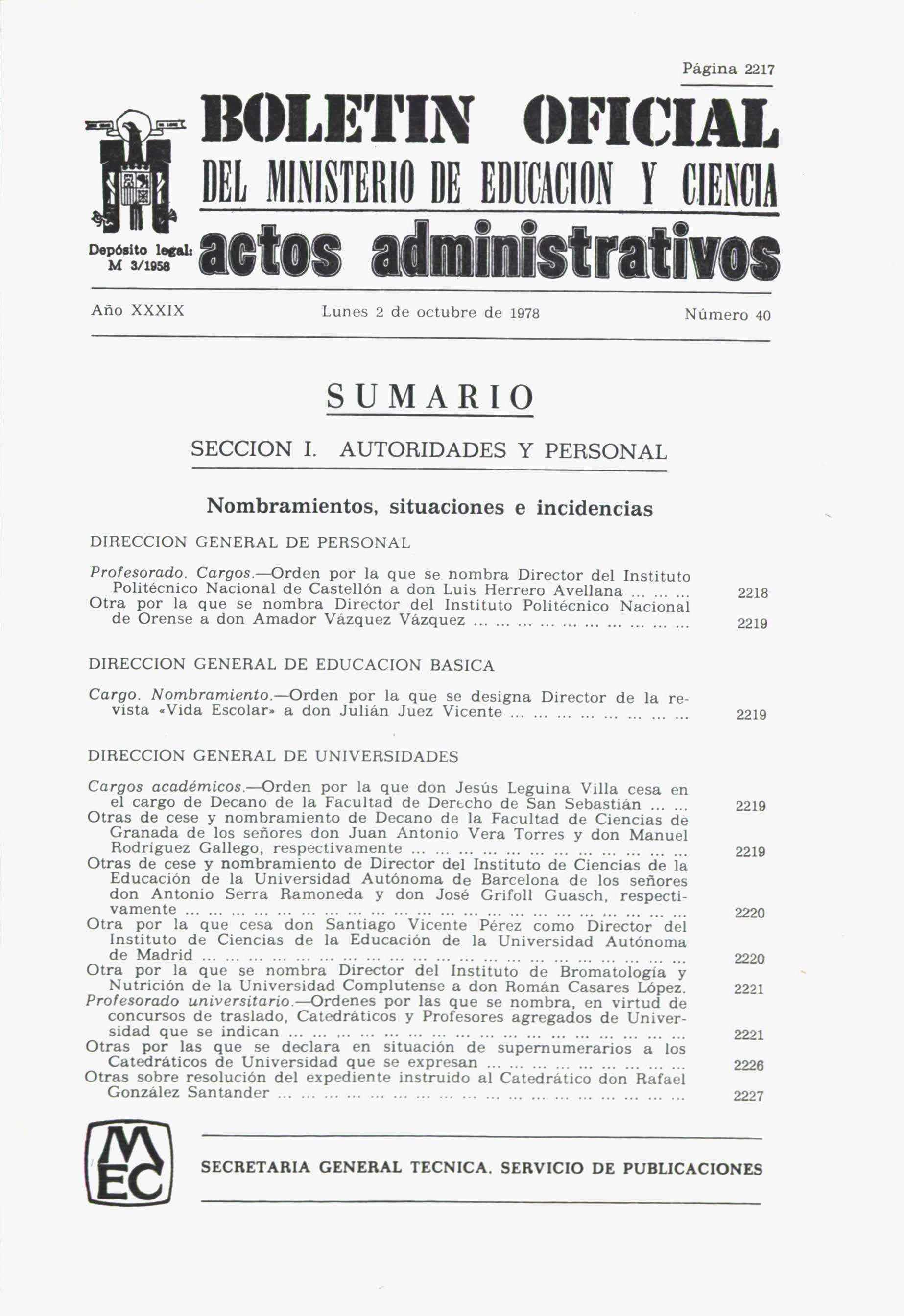 Boletín Oficial del Ministerio de Educación y Ciencia año 1978-4. Actos Administrativos. Números del 40 al 52 e índice 4º trimestre
