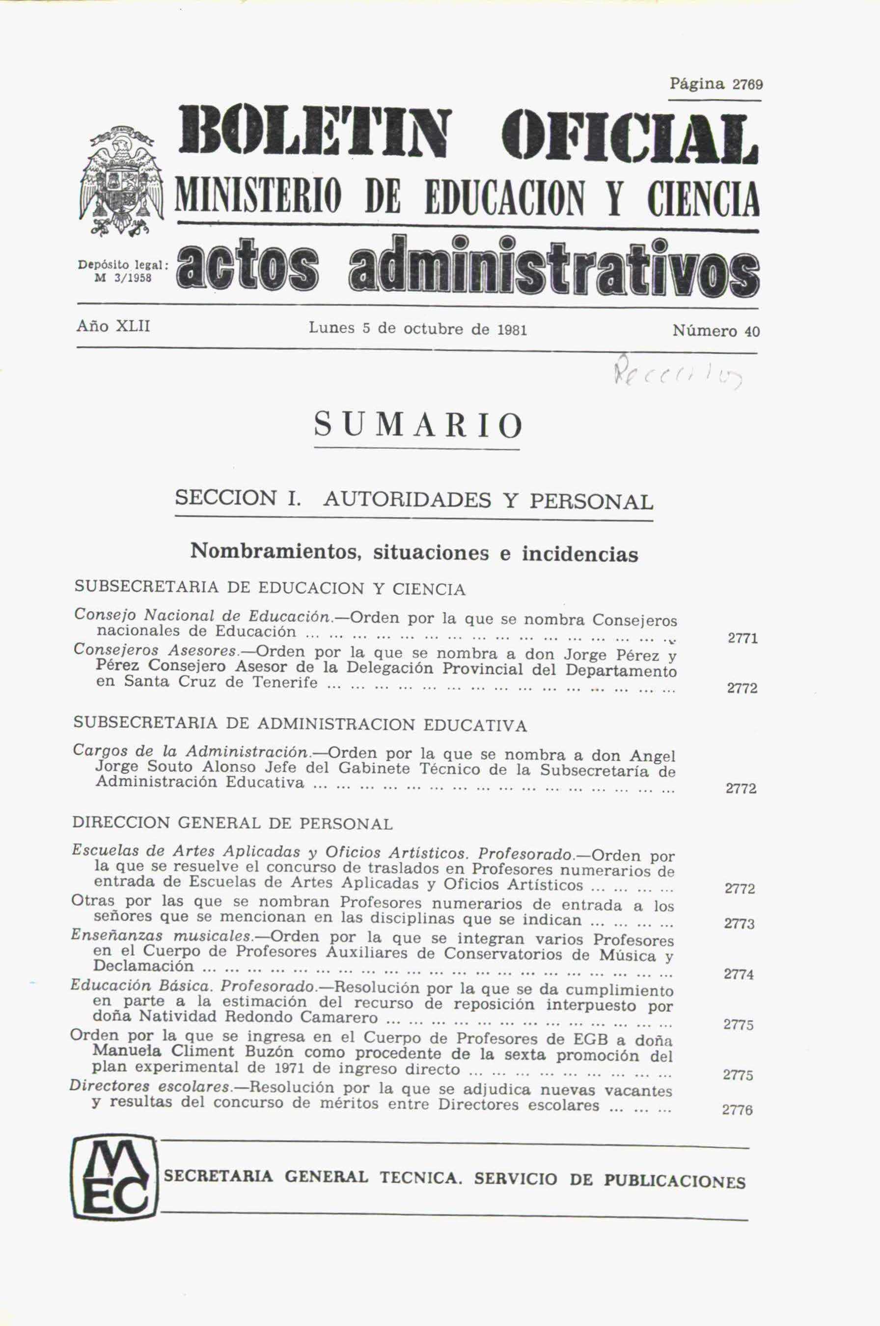 Boletín Oficial del Ministerio de Educación y Ciencia año 1981-4. Actos Administrativos. Números del 40 al 52 e índice 3º trimestre
