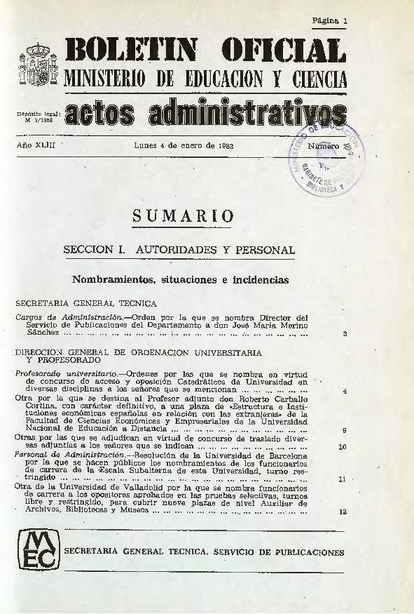 Boletín Oficial del Ministerio de Educación y Ciencia año 1982-1. Actos Administrativos. Números del 1 al 13 e índice 4º trimestre 1981