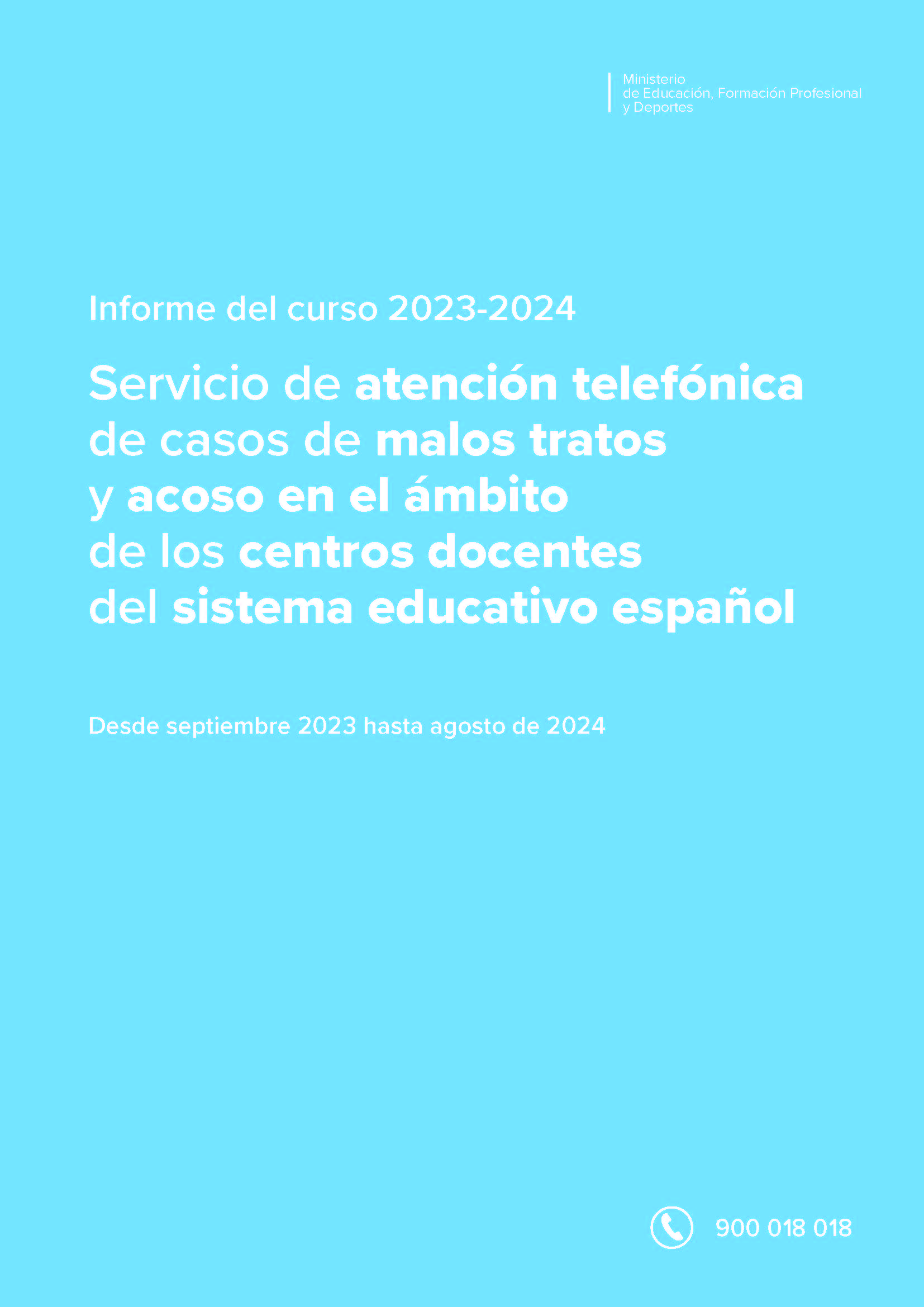 La Subdirección General de Cooperación Territorial e Innovación Educativa ha coordinado la elaboración del «Informe del curso 2023-2024 del Servicio de Atención Telefónica de casos de malos tratos y acoso en los centros docentes del sistema educativo español» (tfno. 900 018 018) a partir de los datos facilitados por la empresa adjudicataria de este servicio, Fundación ANAR.