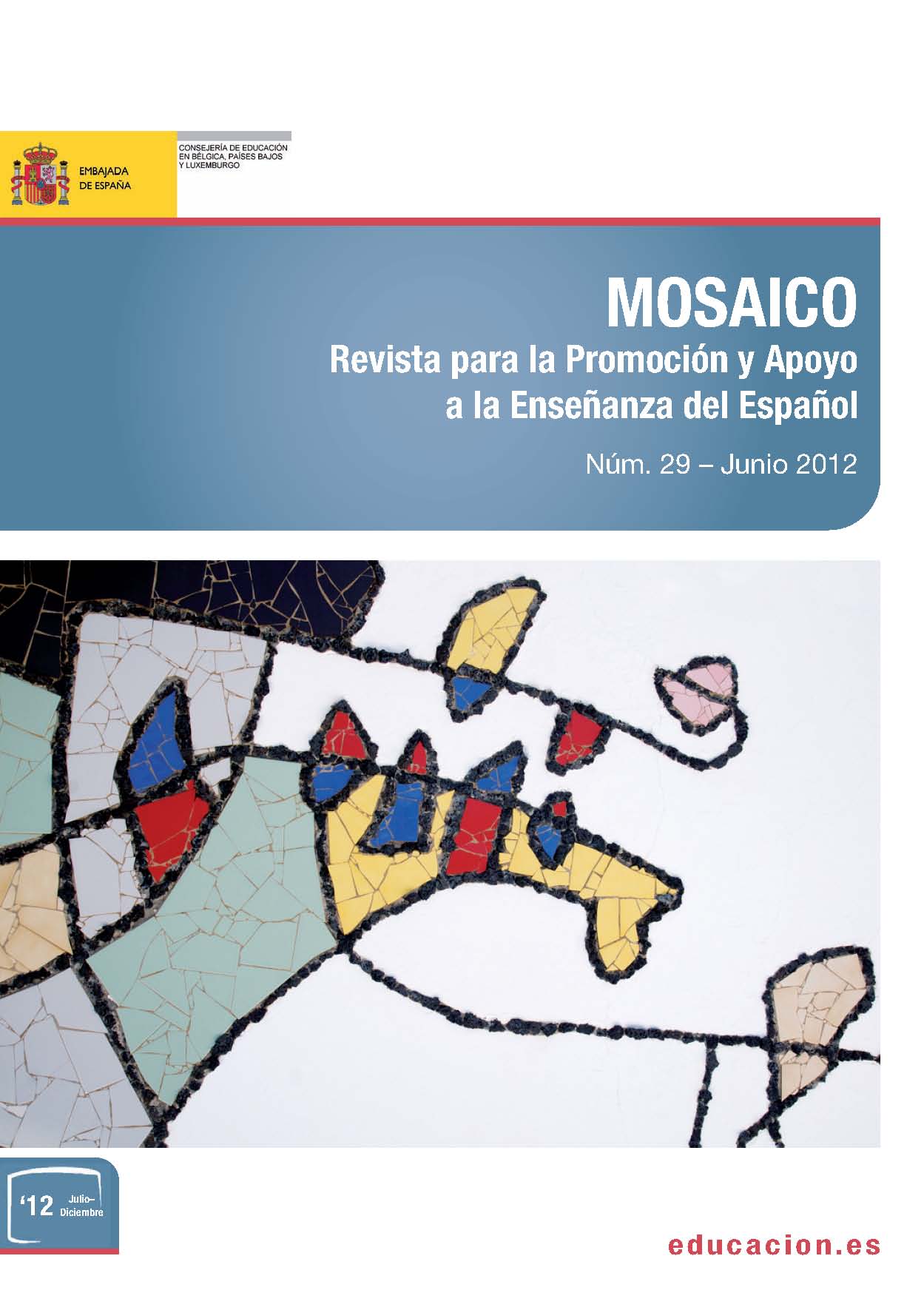 La revista Mosaico es un instrumento de promoción y apoyo a la enseñanza del español, elaborado por la Consejería de Educación en Bélgica, Países Bajos y Luxemburgo que se publica con periodicidad semestral y que se distribuye, de manera gratuita, en los meses de junio y diciembre. La revista contiene colaboraciones relacionadas con los siguientes apartados: Artículos sobre temas lingüísticos y pedagógicos. Experiencias didácticas/talleres: propuestas para llevar a la clase de ELE en sus distintos niveles. Bien dicho y bien escrito. Reseñas: presentación, descripción y comentario de novedades editoriales en el campo de la didáctica de ELE. Fichas: actividades preparadas por profesores para ser llevadas a las clases de ELE con indicaciones para su explotación didáctica. Informaciones: calendario de actividades y noticias sobre la acción educativa desarrollada por la Consejería de Educación en el campo de la lengua y la cultura españolas.
