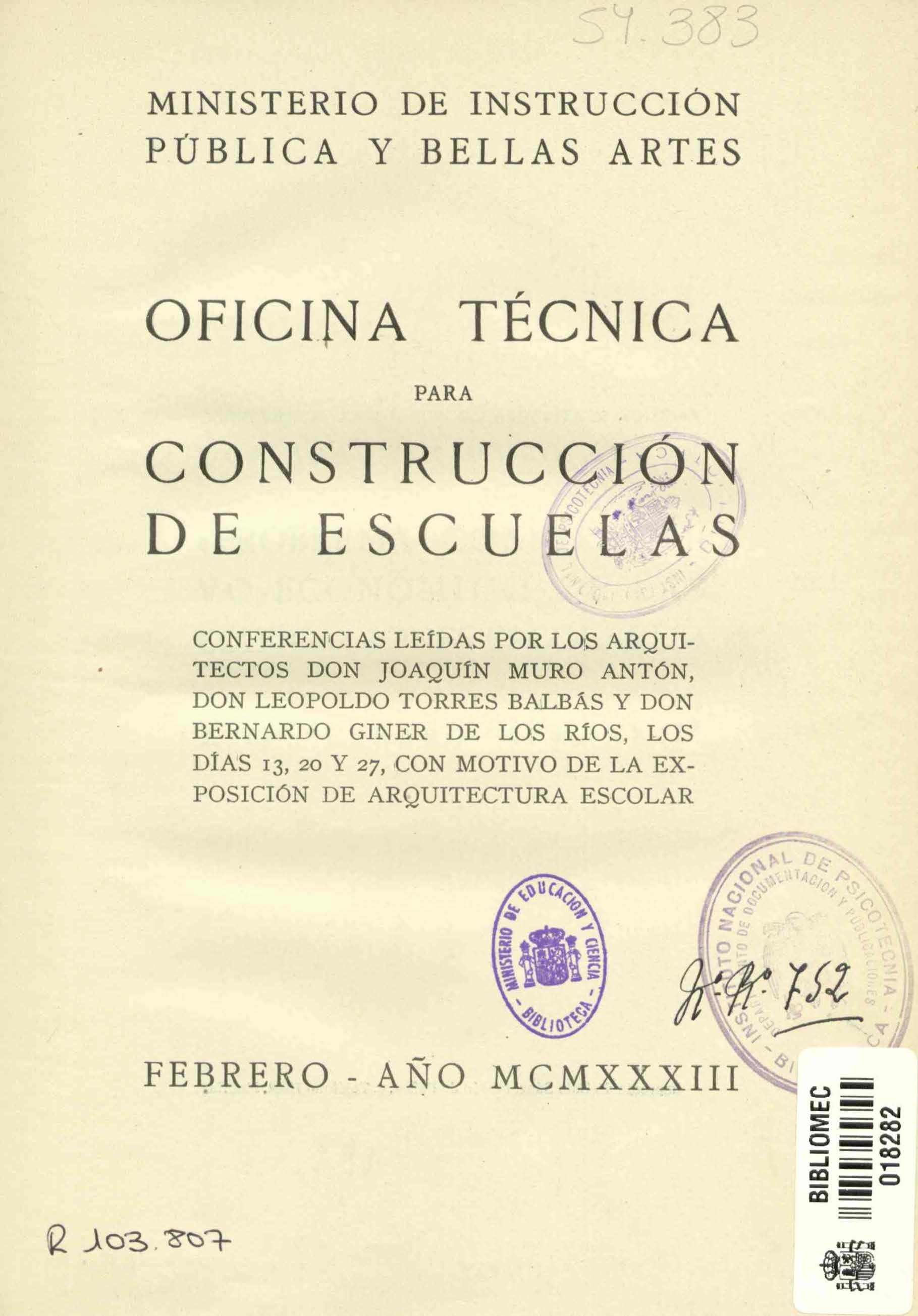 Conferencias leídas por los arquitectos Don Joaquín Muro Antón, Don Leopoldo Torres Balbás y Don Bernardo Giner de los Ríos, los días 13.20 y 27, con motivo de la exposición de arquitectura escolar.