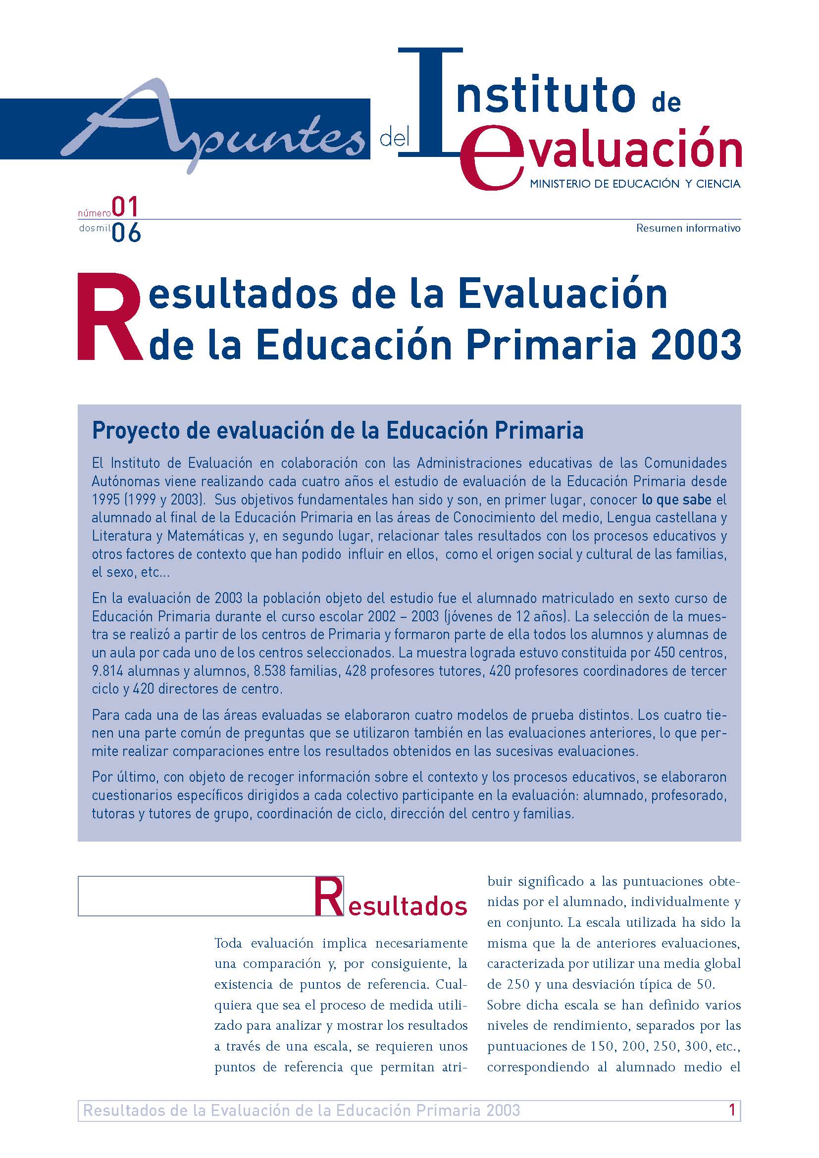 Apuntes del Instituto de Evaluación. Resumen informativo nº 13. Evaluación de la educación primaria