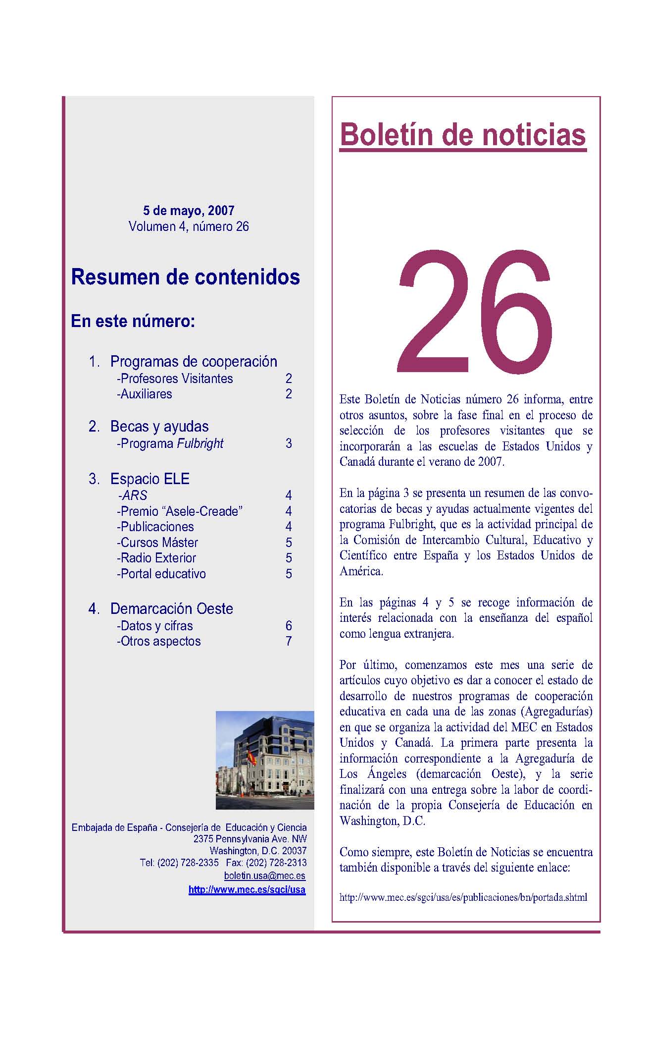 Este Boletín de noticias número 26 informa sobre el estado actual de desarrollo de los programas de cooperación educativa que gestiona la Consejería de Educación y Ciencia en Estados Unidos y Canadá.