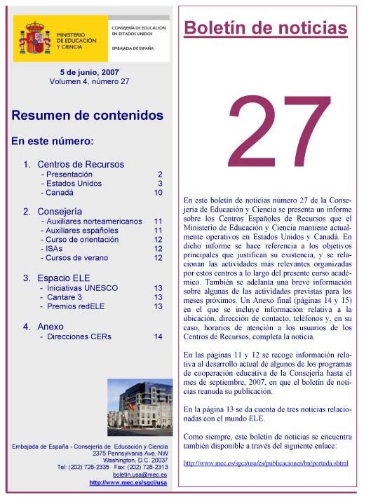 Este Boletín de noticias número 27 informa sobre el estado actual de desarrollo de los programas de cooperación educativa que gestiona la Consejería de Educación y Ciencia en Estados Unidos y Canadá.