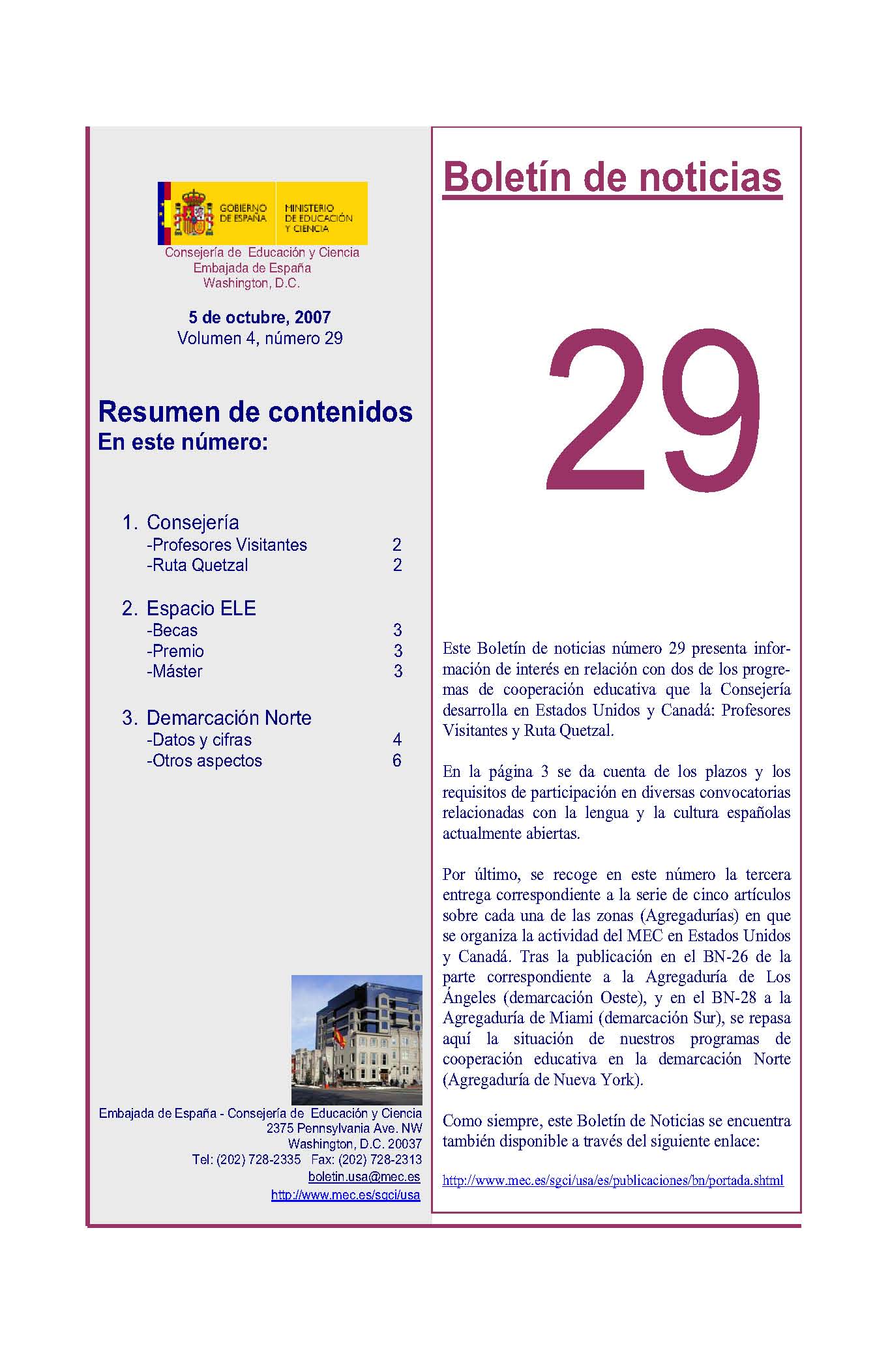 Este Boletín de noticias número 29 informa sobre el estado actual de desarrollo de los programas de cooperación educativa que gestiona la Consejería de Educación y Ciencia en Estados Unidos y Canadá.