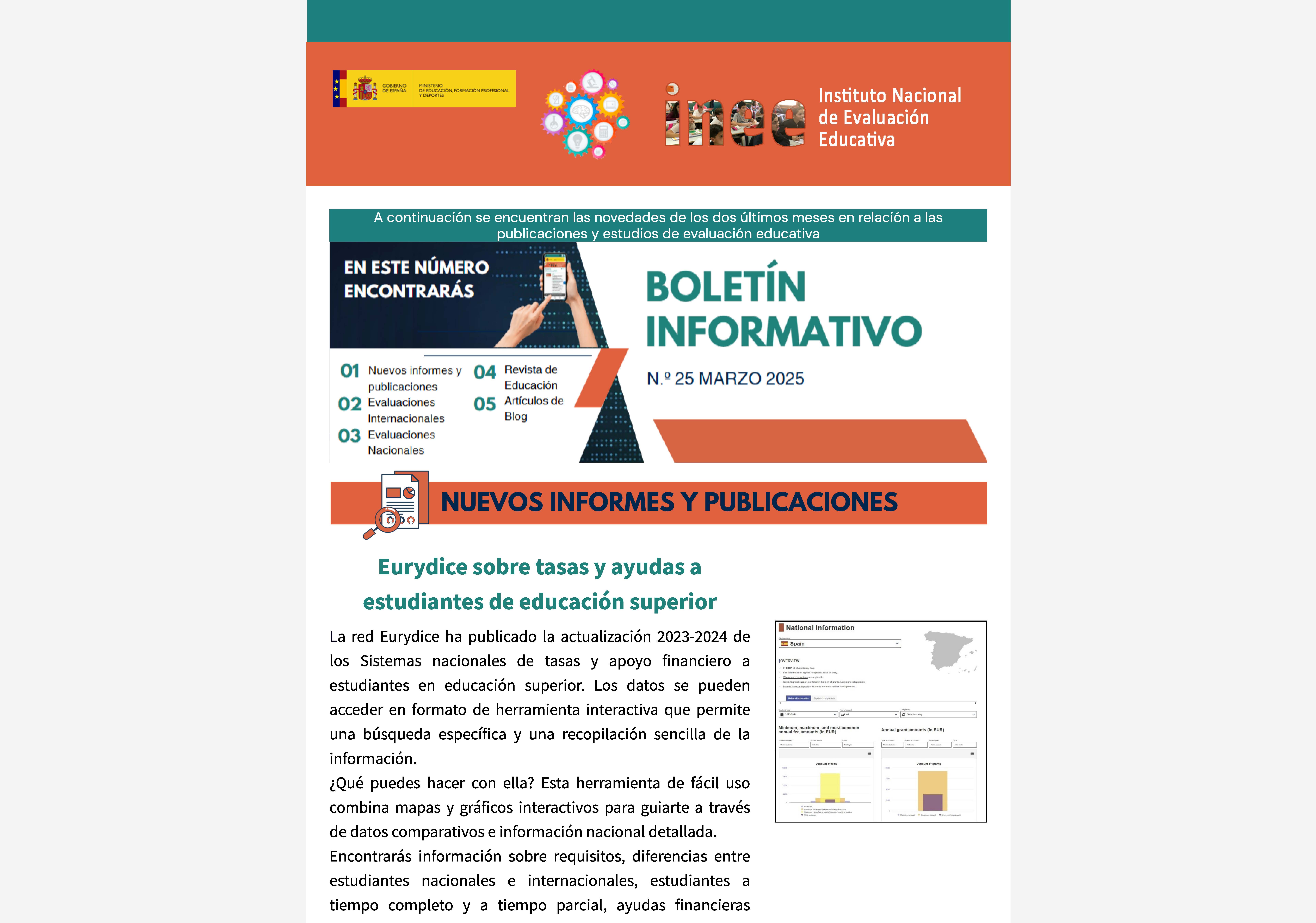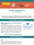 El Boletín Informativo del INEE es una publicación periódica que presenta información sobre las evaluaciones e indicadores educativos, tanto nacionales como internacionales, así como sobre los estudios de evaluación educativa en los que participa el INEE. Este boletín se publicó por primera vez en enero de 2021 y tiene una periodicidad bimensual. El boletín recoge las últimas novedades y publicaciones de evaluación educativa con el fin de informar a la comunidad educativa.